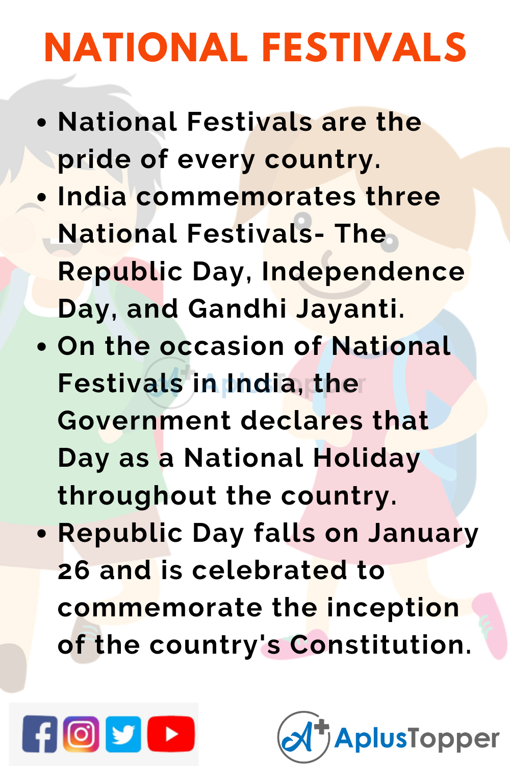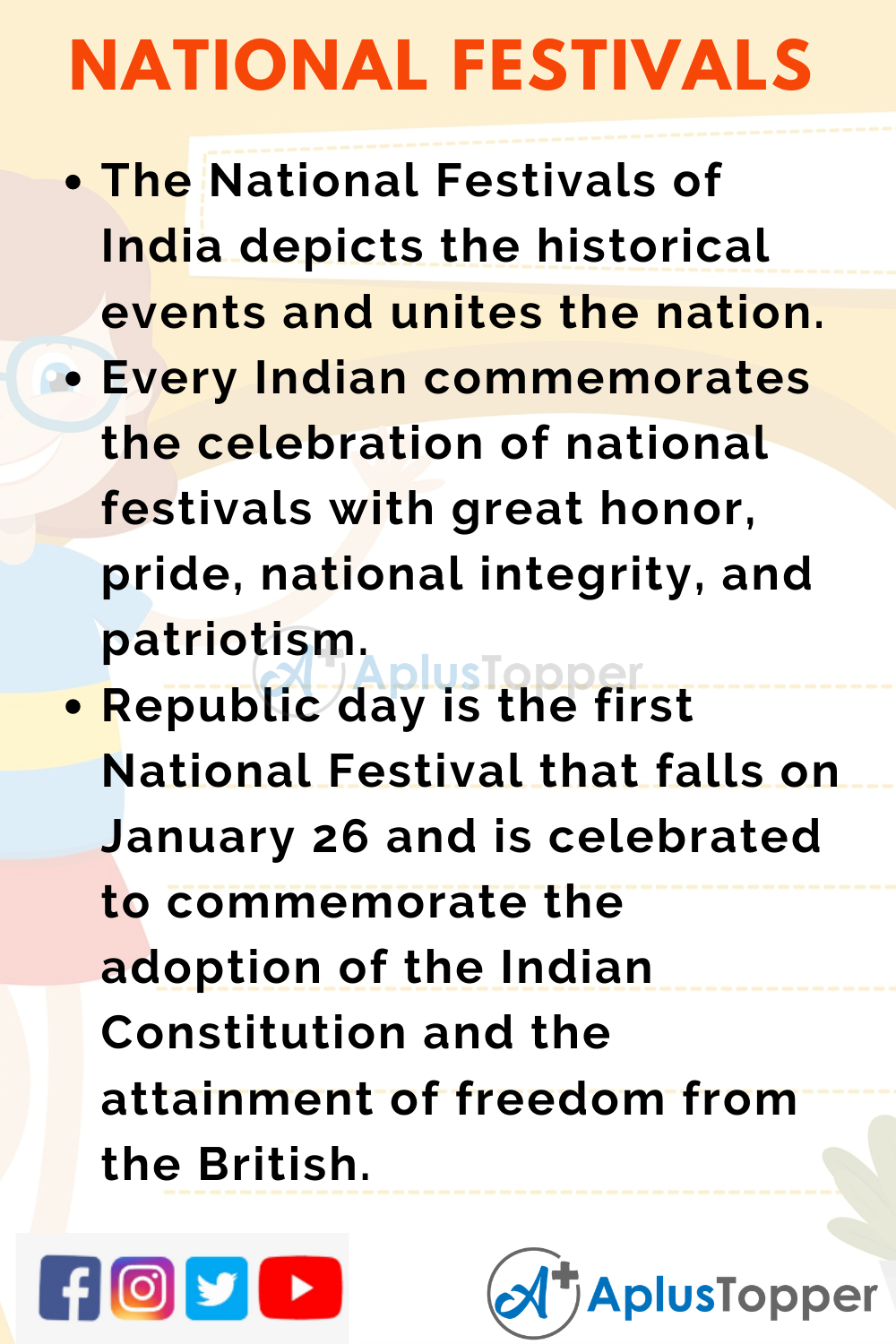 Through the below-mentioned ten lines on the Importance of National Festivals of India in English, we provide you information to formulate paragraph writings and essays on this topic as well to assist you during competitive exams and G.K. quizzes.