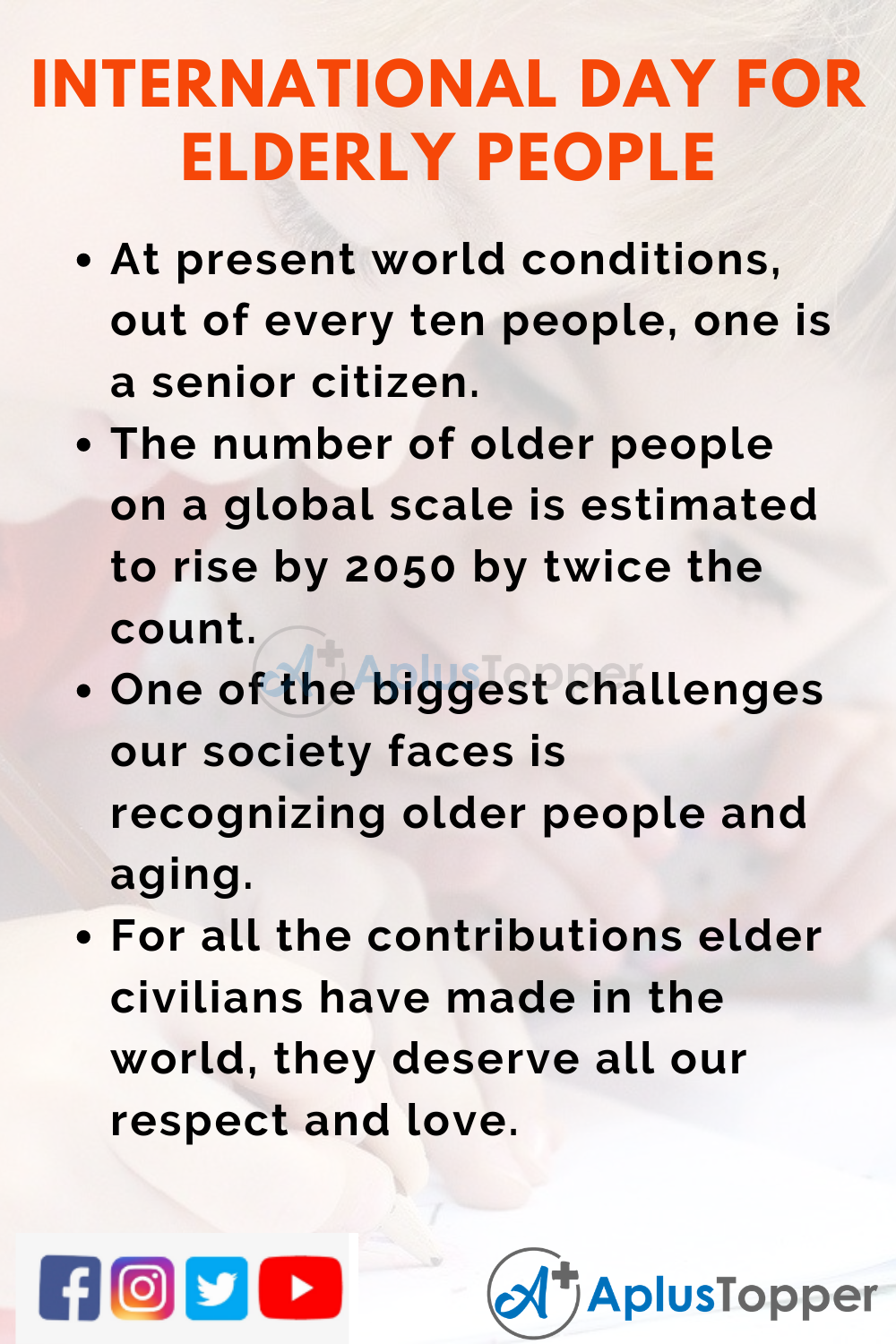 - International Day for Elderly People celebrated every year to create awareness about the challenges of aging in today’s world.