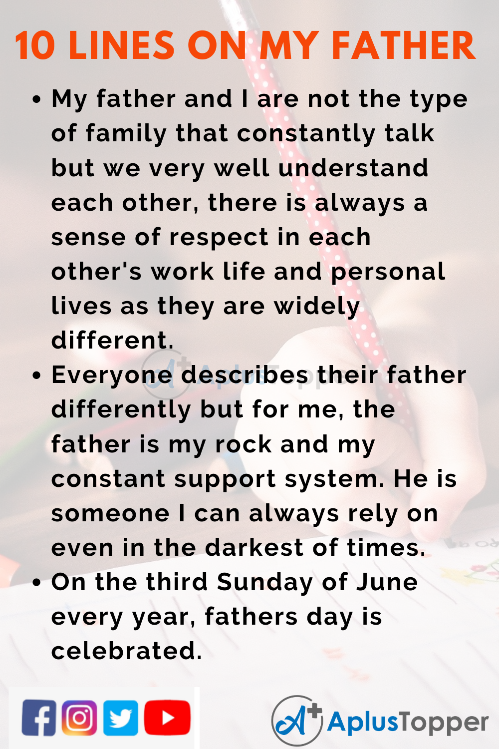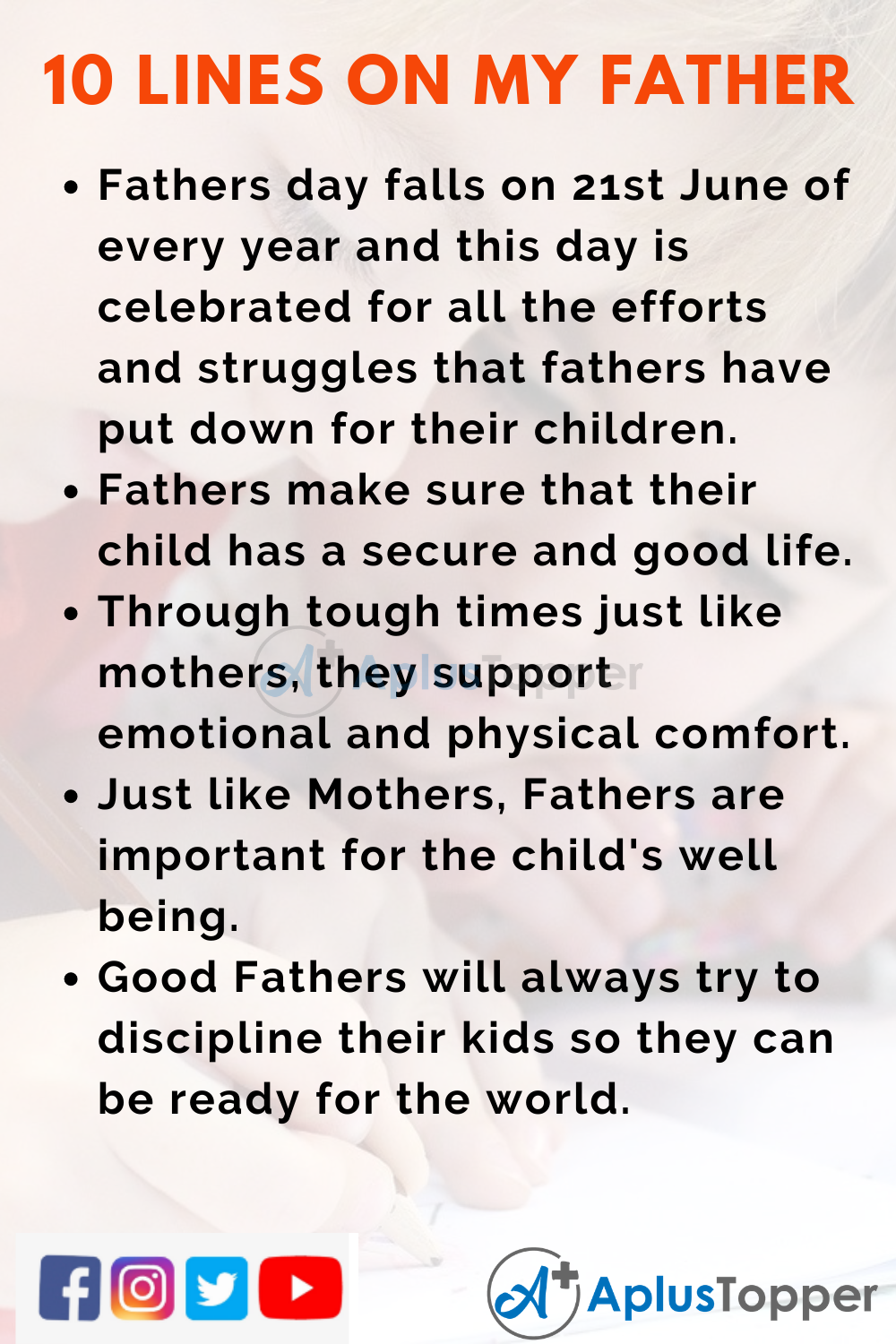 10 Lines on My Father: Fathers play a major role in a child’s life, their characteristics and behaviour are what helps mould a child. The way the fathers treat their child is reflected in all aspects of the child’s life. No matter the scenario, they play a huge influence on their child’s life just like mothers. In a way, children feel different things from their father like security or they try to copy the same behaviour from their father. Just like how mothers are a vital support system, fathers are just as essential as they teach us different values and skills. Their kind of support can be reflected in a child’s relationship with other people.