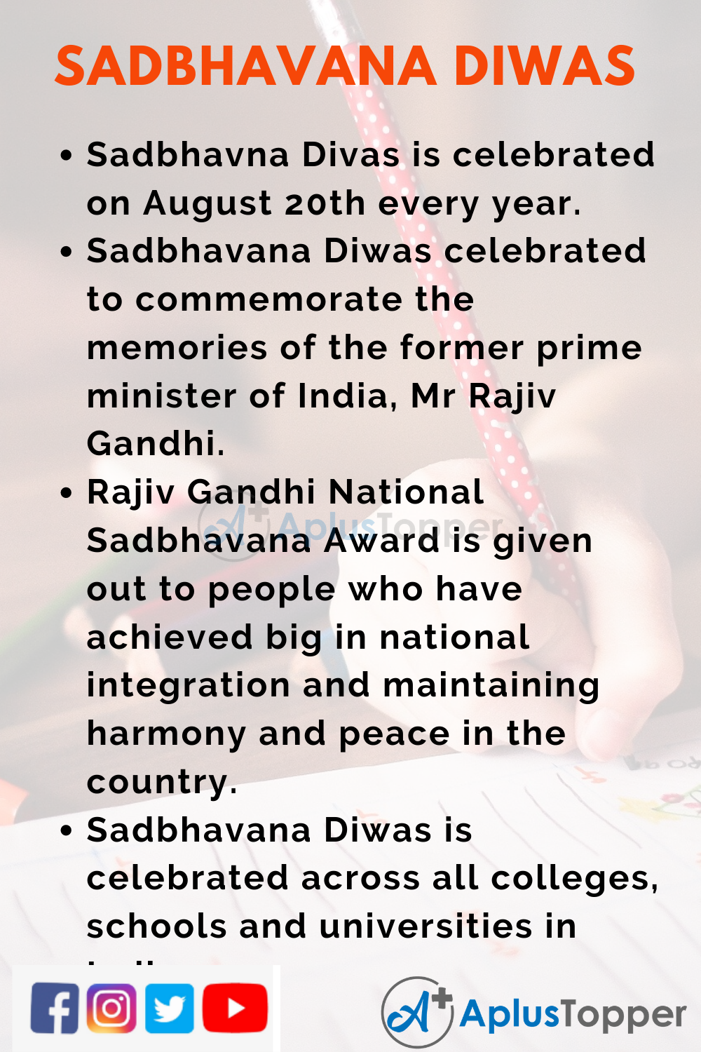 10 Lines on Sadbhavana Diwas: Sadbhavana Diwas is observed and celebrated on the birth anniversary of our former Prime Minister of India, Rajiv Gandhi. On August 20th of every year, Sadbhavana Diwas is celebrated and observed to commemorate the achievements of Rajiv Gandhi and the values that he represented that runs through every Indian till date.
