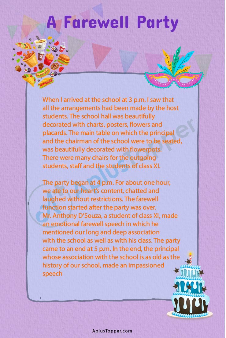 A Farewell Party Essay – Given below is a Long and Short Essay on A Farewell Party for aspirants of competitive exams, kids and students belonging to classes 1, 2, 3, 4, 5 6, 7, 8, 9, and 10. A Farewell Party essay 100, 150, 200, 250 words in English helps the students with their class assignments, comprehension tasks, and even for competitive examinations.