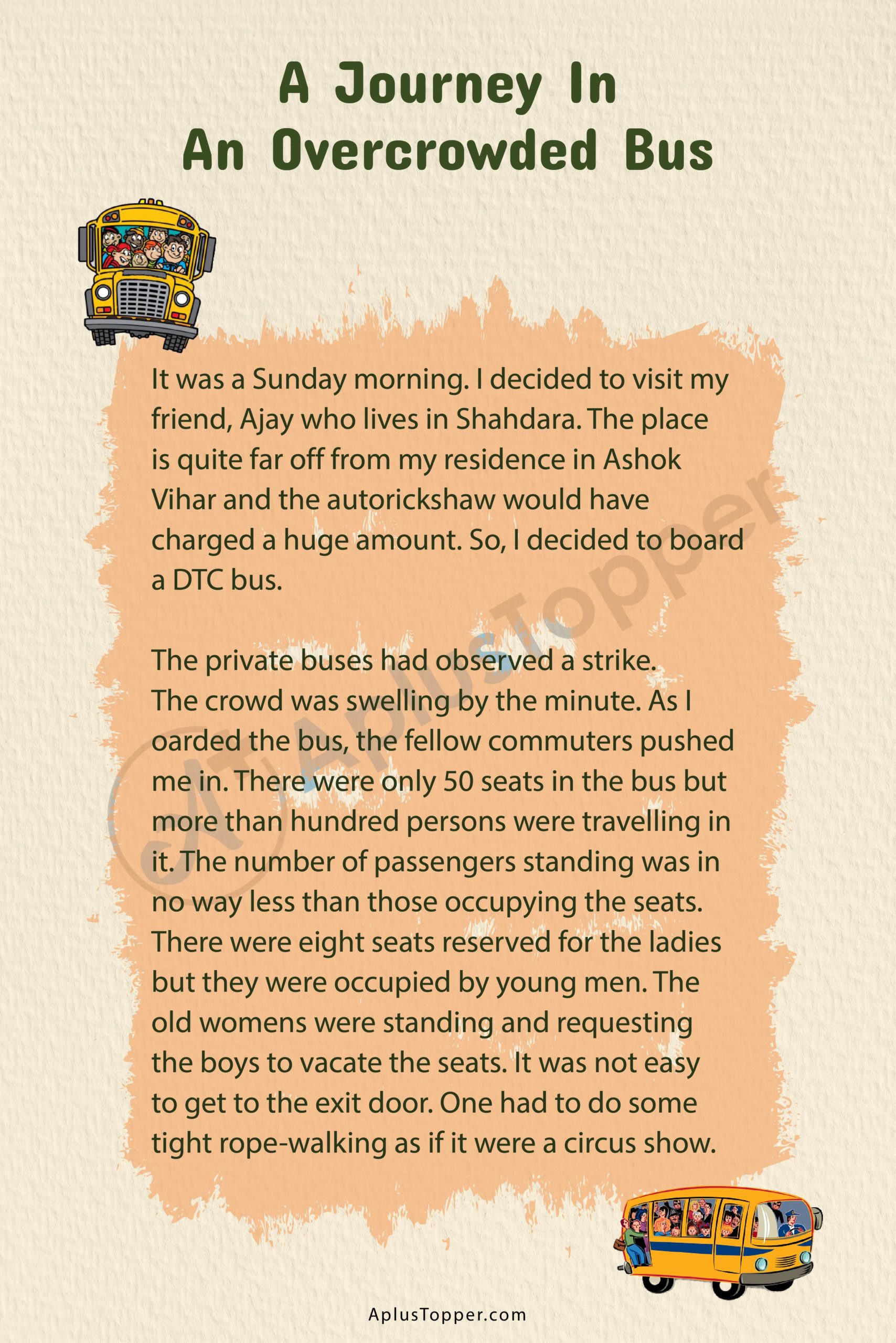 A Journey In An Overcrowded Bus Essay – Given below is a Long and Short Essay on A Journey In An Overcrowded Bus of competitive exams, kids and students belonging to classes 1, 2, 3, 4, 5 6, 7, 8, 9, and 10. A Journey In An Overcrowded Bus essay 100, 150, 200, 250, 300 words in English helps the students with their class assignments, comprehension tasks, and even for competitive examinations.