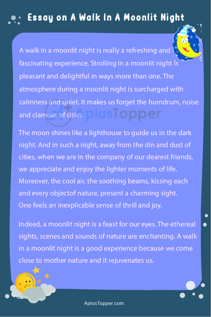 A Walk In A Moonlit Night Essay – Given below is a Long and Short Essay on A Walk In A Moonlit Night of competitive exams, kids and students belonging to classes 1, 2, 3, 4, 5 6, 7, 8, 9, and 10. A Walk In A Moonlit Night essay 100, 150, 200, 250 words in English helps the students with their class assignments, comprehension tasks, and even for competitive examinations.