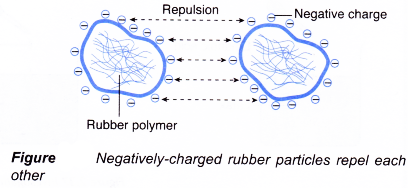 - Negative charges are found on the surface of the membrane, making each rubber particle negatively charged. The negatively-charged rubber particles repel each other, preventing themselves from combining and coagulating.