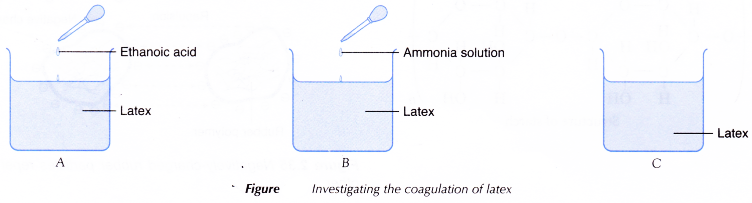 - Ammonia solution is added drop by drop into beaker B until the latex becomes alkaline (red litmus paper turns blue). The mixture is stirred after each addition of alkali.