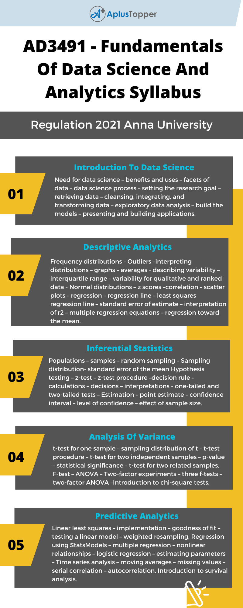 Subject code AD3491 deals with semester IV of B.Tech Artificial Intelligence and Data Science regarding affiliated institutions of Anna University Regulation 2021 Syllabus. In this article, you can gather certain information relevant to the Fundamentals Of Data Science And Analytics. We added the information by expertise.