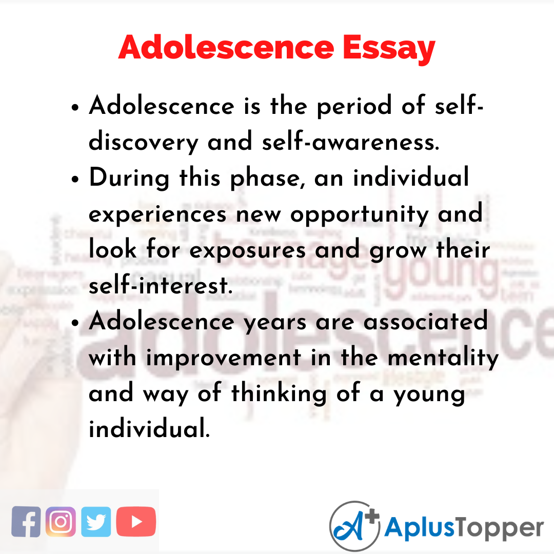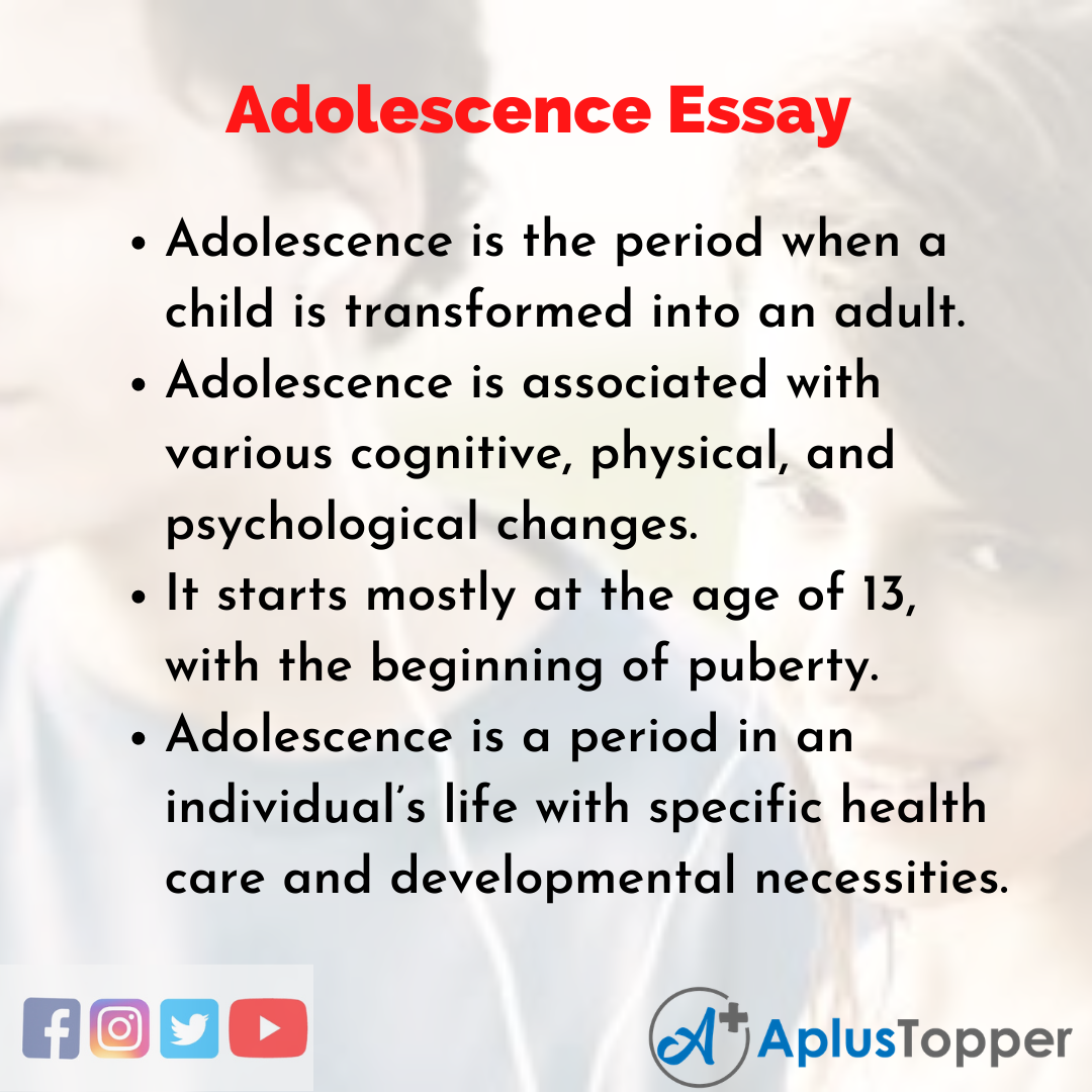 Adolescence Essay: Adolescence is the phase of transition between childhood and adulthood. It involves the physical and psychological growth and development of a person during the puberty period and is usually marked by the teenage years. The ages between 10 to 24 are generally said to be adolescence period.