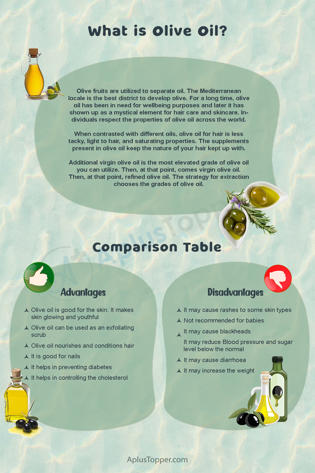 | Olive oil is good for the skin. It makes skin glowing and youthful | It may cause rashes to some skin types |