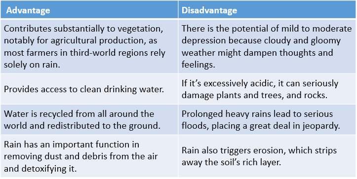 | Contributes substantially to vegetation, notably for agricultural production, as most farmers in third-world regions rely solely on rain. | There is the potential of mild to moderate depression because cloudy and gloomy weather might dampen thoughts and feelings. |