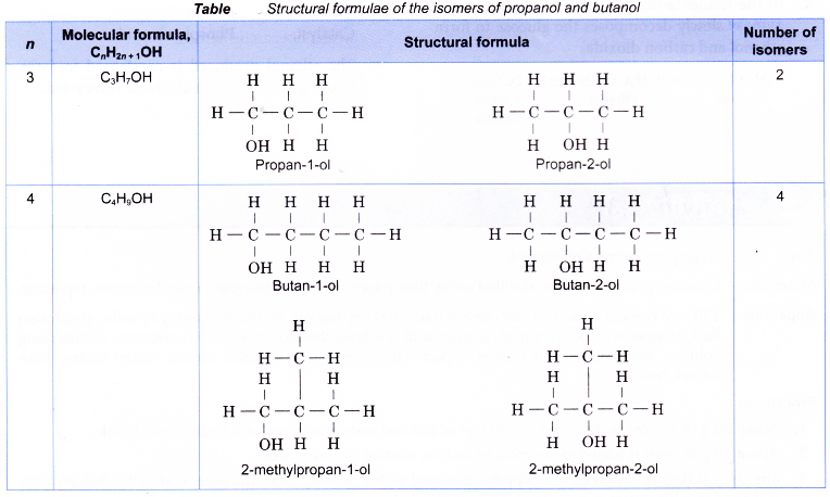 Table shows the structural formulae of the isomers of propanol and butanol.