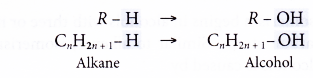 - Alcohols may be considered to be derived from an alkane by the replacement of one hydrogen atom by the hydroxyl group.
