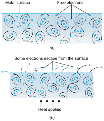 - If the metal is heated to a high temperature as shown in Figure (b), some of the free electrons may gain sufficient energy to escape from the metal.
