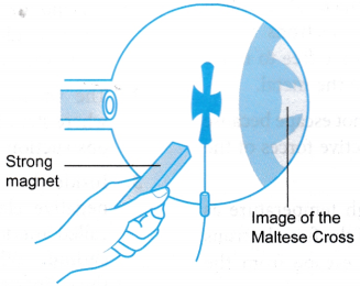 - When a strong magnet is placed at the side of the Maltese Cross tube, the shadow cast by the cathode rays is moved and distorted. The shadow cast by light which is not affected by the magnet will stay at the centre of the screen.