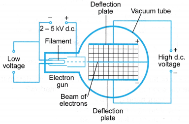 - When a cathode ray deflection tube is connected as shown in Figure, the cathode rays are seen deflected towards the positive plate and away from the negative plate.