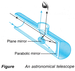 - An astronomical reflecting telescope uses a large parabolic mirror to gather dim light from distant stars. A plane mirror is used to reflect the image to the eyepiece.