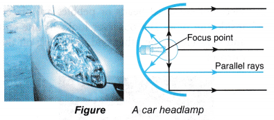 - Parabolic mirrors are used in torches and car headlamps as reflectors. A small lamp is placed at the focus point of the mirror to produce parallel rays.
