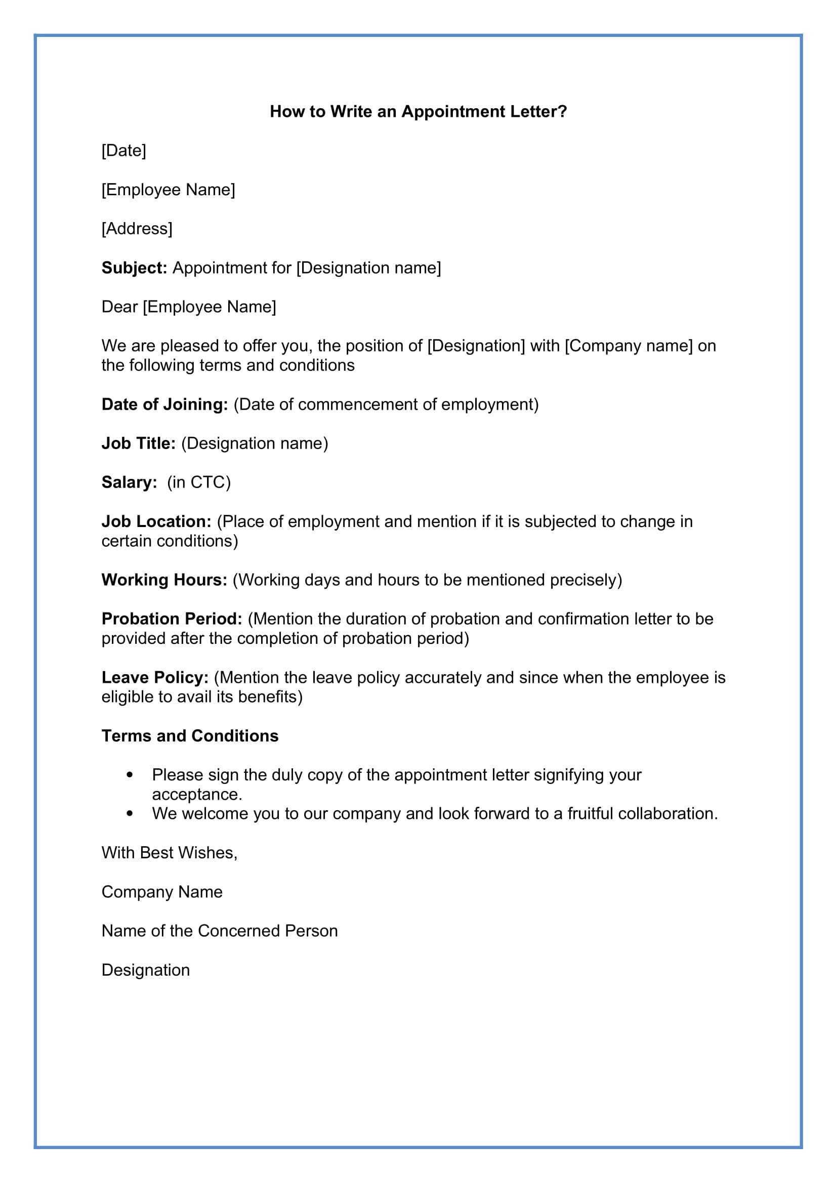 Writing an appointment letter becomes easy when there is a format available. Hence, here is a format to write the appointment letter, you can follow in general. This template is very useful to write the appointment letter of any kind for general private companies.