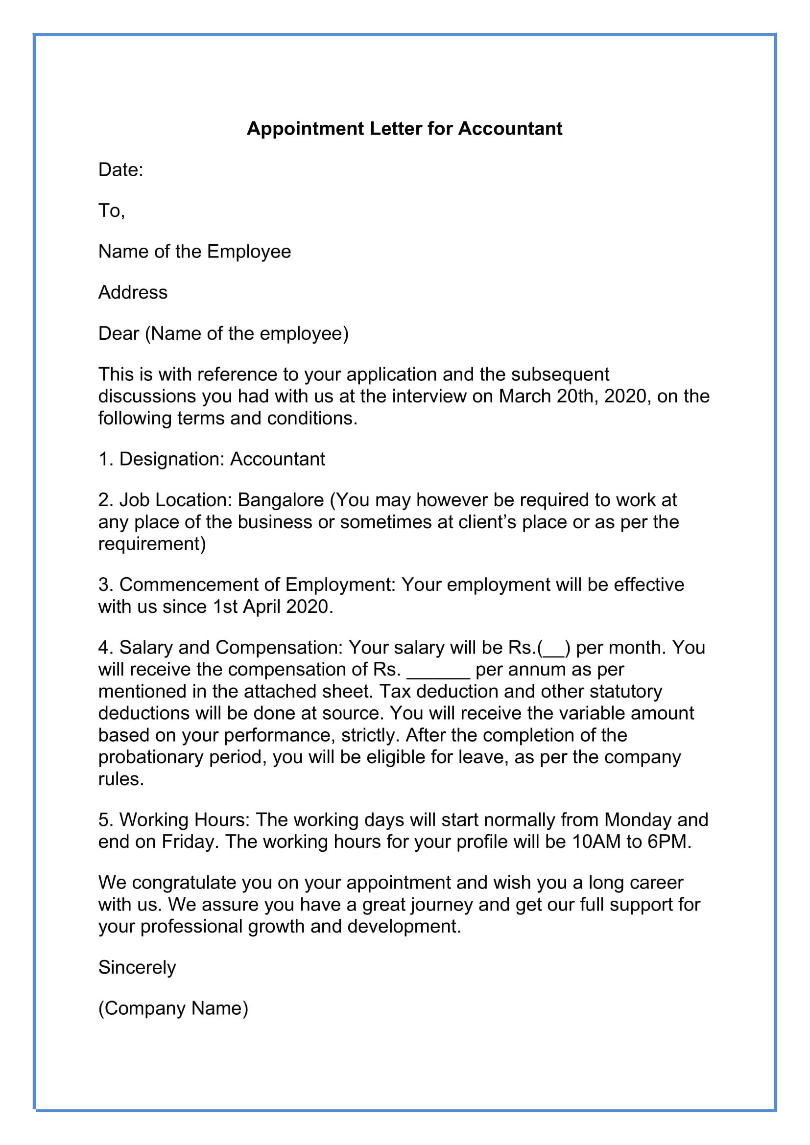 An appointment letter format India for the position of Accountant should consist of the date of joining, job location, salary and benefits, working hours specifically on it. A sample letter is provided below for reference.