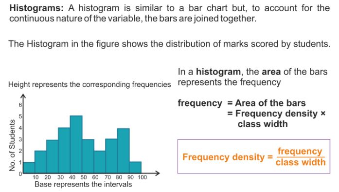 A histogram is a graphical representation of frequency distribution in the form of rectangle with class interval as the bases and heights proportional to corresponding frequency. There is no gap between rectangles.