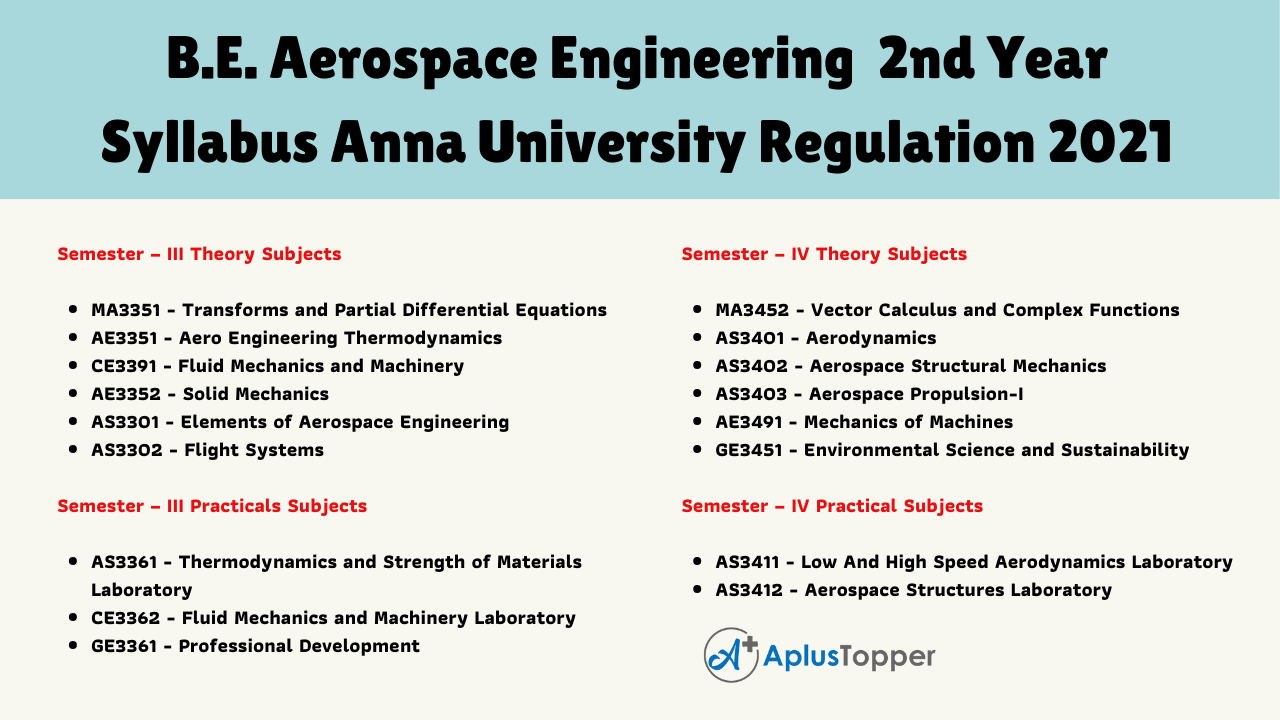 Anna University Regulation 2021 B.E Aerospace Engineering 2nd year syllabus contains two semesters. In semester 3, there are six theory subjects and three practical subjects. In semester 4, there are six theory subjects and two practical subjects. The following links will help you to get the required subject as per your need.