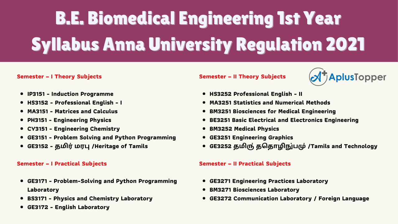 Anna University Regulation 2021 B.E. Biomedical Engineering 1st-year syllabus contains two semesters. In semester 1, there are six theory subjects and three practical subjects. In semester 2, there are six theory subjects and three practical subjects. The following links will help you to get the required subject as per your need.