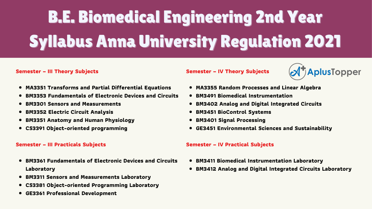 Anna University Regulation 2021 B.E. Biomedical Engineering 2nd-year syllabus contains two semesters. In semester 3, there are five theory subjects and three practical subjects. In semester 4, there are six theory subjects and Four practical subjects. The following links will help you to get the required subject as per your need.