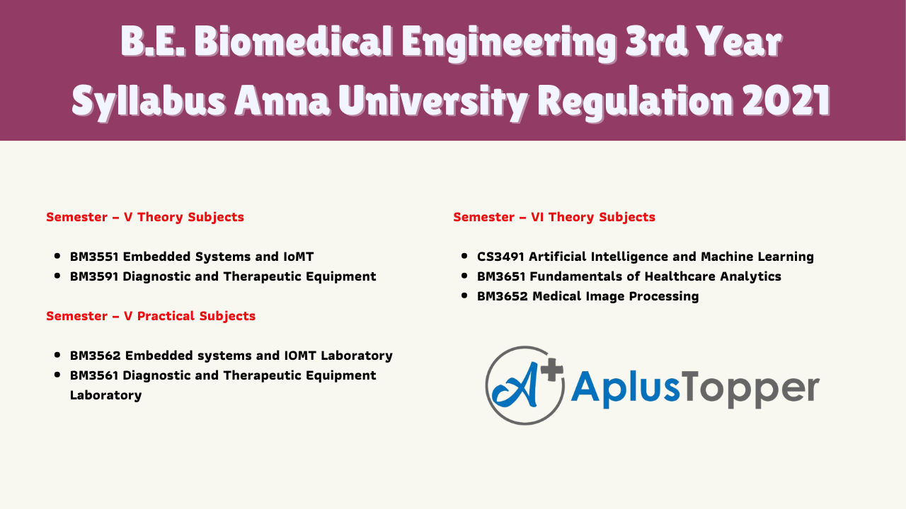 Anna University Regulation 2021 B.E. Biomedical Engineering 3rd-year syllabus contains two semesters. In semester 5, there are two theory subjects and two practical subjects. In semester 6, there are three theory subjects. The following links will help you to get the required subject as per your need.