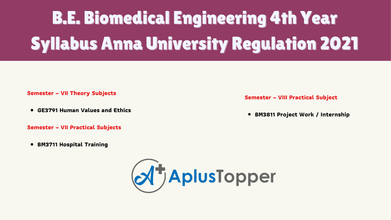 Anna University Regulation 2021 B.E. Biomedical Engineering 4th-year syllabus contains two semesters. In semester 7, there is one theory and one practical subject. In semester 8, there is one practical subject. The following links will help you to get the required subject as per your need.