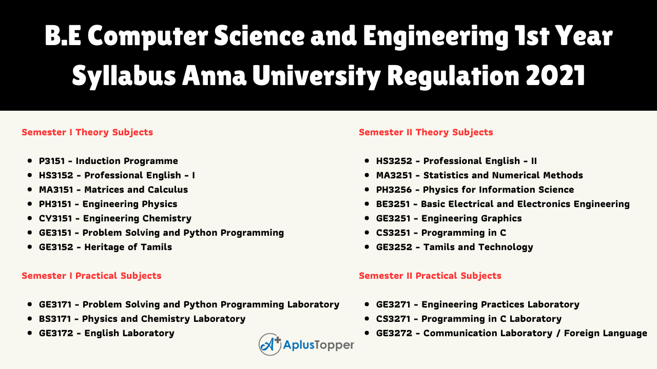 B.E Computer Science And Engineering Syllabus of First Year Anna University Regulation 2021 consists of two semesters. Each semester consists of both theory and practical subjects. In the First Semester, There are seven subjects in the theory part. And three subjects in the practical part. In The Second Semester, There are seven subjects in the theory part. And three subjects in the practical part. Kindly follow the below-given links for the required syllabus you desire to read.