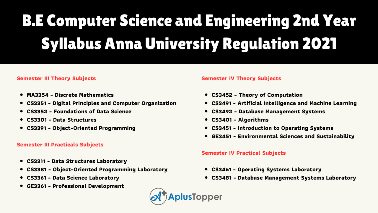 B.E Computer Science And Engineering Syllabus of Second Year Anna University Regulation 2021 consists of two semesters. Each semester consists of both theory and practical subjects. In the Third Semester, There are Five subjects in the theory part. And Four subjects in the practical part. In The Fourth Semester, There are six subjects in the theory part. And Two subjects in the practical part. Kindly follow the below-given links for the required syllabus you desire to read.