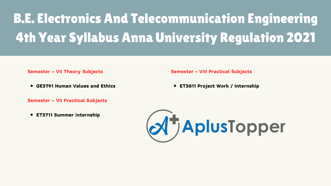 In the Fourth year Anna University, B.E Electronics and Telecommunication Engineering conducts semester mode examinations each year of the four-year undergraduate program. In the Fourth year, there are two semesters. Each semester consists of both theory and practical subjects. In the 7th semester, there is one theory subject and one practical subject. In the 8th semester, there is one practical subject. The following links will assist you in getting your required subject in the given below article.