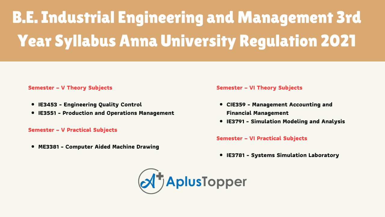 Anna University, B.E Industrial Engineering and Management 3rd year syllabus has both theory and practical subjects. There are two semesters. In semester V, There are Two theory subjects and one practical subject. In semester VI, There are two theory and one practical subject. The following links will help you to get the required subject for examinations.