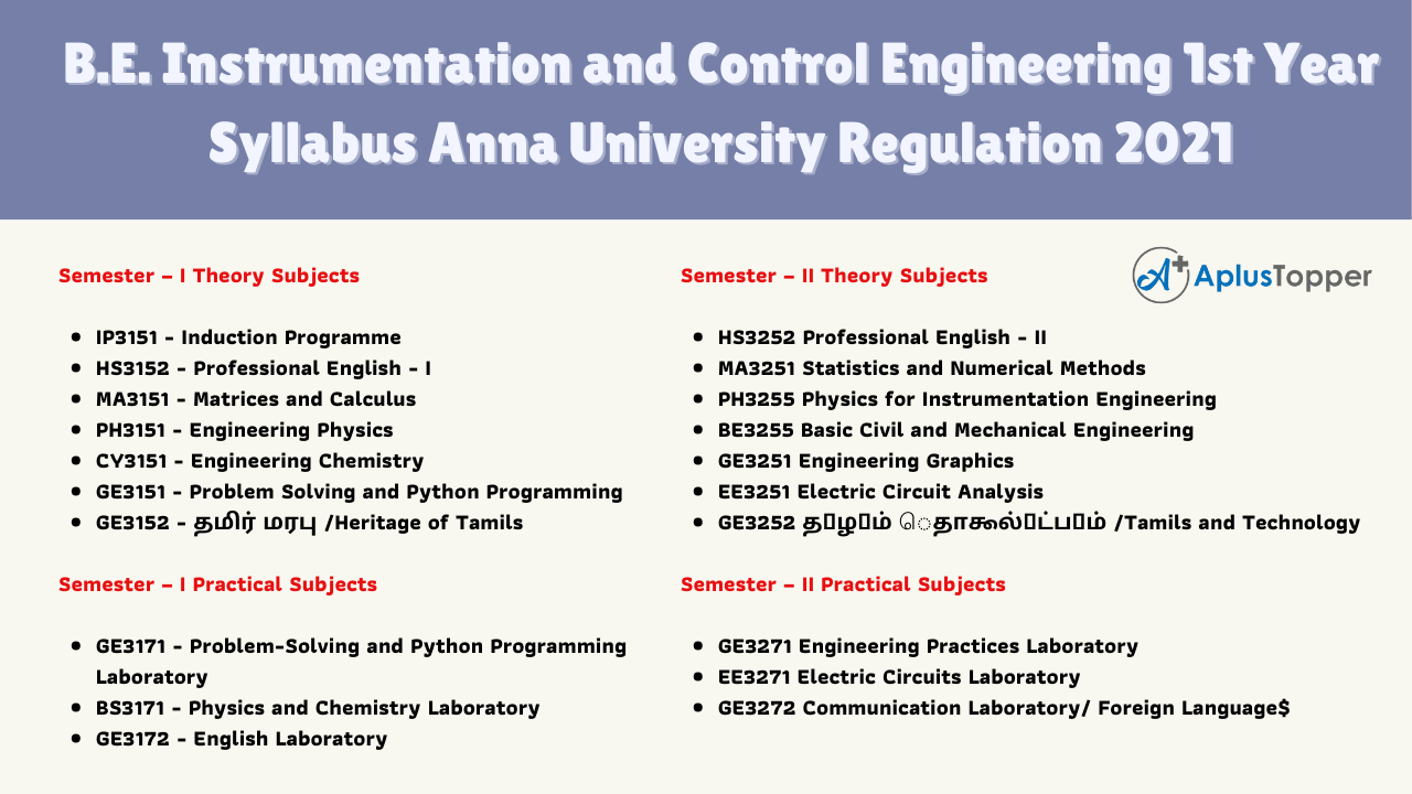 Anna University Regulation 2021 B.E Instrumentation and Control Engineering 1st-year syllabus contains two semesters. In semester 1, there are six theory subjects and three practical subjects. In semester 2, there are six theory subjects and three practical subjects. The following links will help you to get the required subject as per your need.