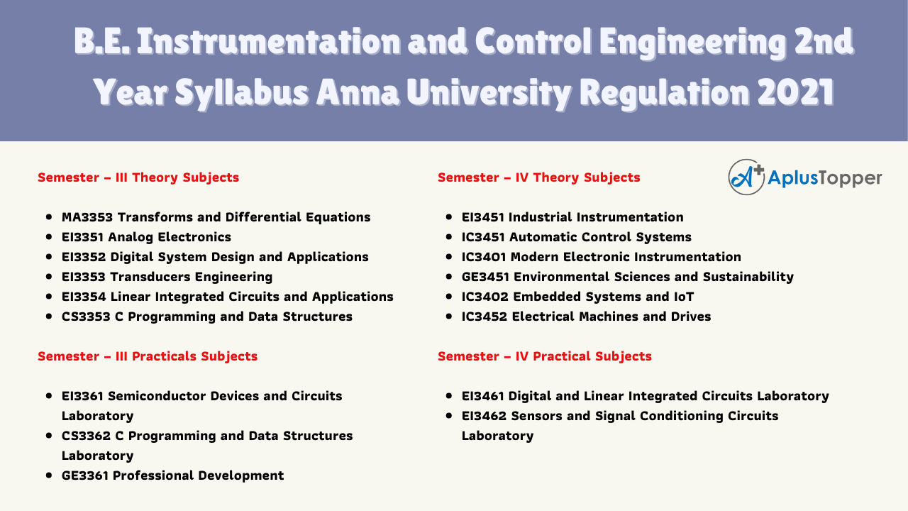 Anna University Regulation 2021 B.E Instrumentation and Control Engineering 2nd-year syllabus contains two semesters. In semester 3, there are six theory subjects and three practical subjects. In semester 4, there are six theory subjects and two practical subjects. The following links will help you to get the required subject as per your need.