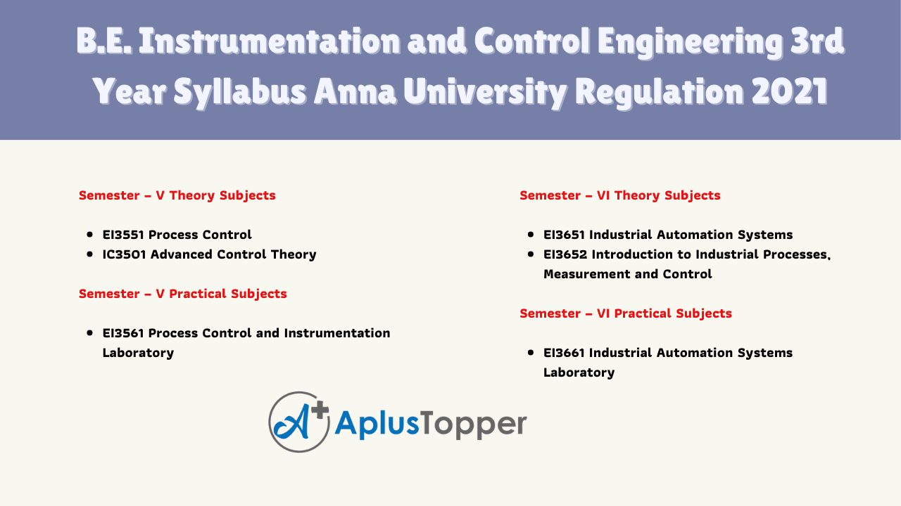 Anna University Regulation 2021 B.E Instrumentation and Control Engineering 3rd-year syllabus contains two semesters. In semester 5, there are two theory subjects and one practical subject. In semester 6, there are two theory subjects and one practical subject. The following links will help you to get the required subject as per your need.