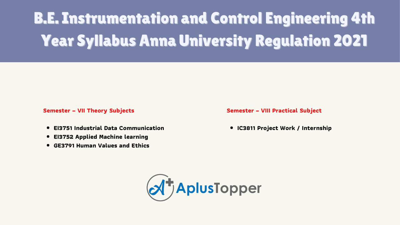 Anna University Regulation 2021 B.E Instrumentation and Control Engineering 4th-year syllabus contains two semesters. In semester 7, there are three theory subjects. In semester 8, there is one practical subject. The following links will help you to get the required subject as per your need.