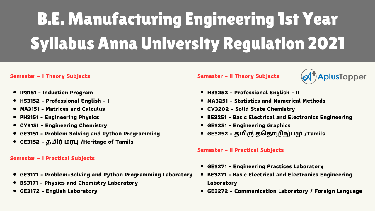 Anna University B.E Manufacturing Engineering 1st year syllabus consists of two semesters. Each semester has both theory and practical subjects. In semester I, there are six theory subjects and three practical subjects. In semester II, There are six theory subjects and three practical subjects.