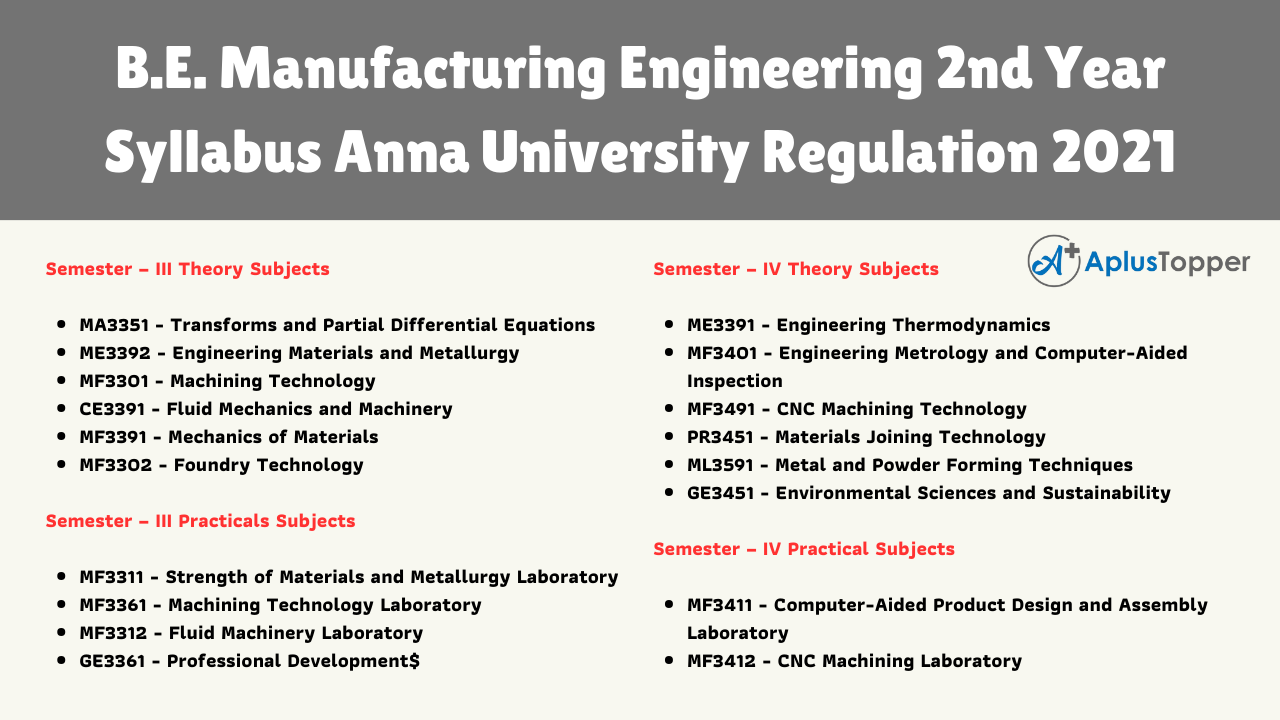 Anna University B.E Manufacturing Engineering 2nd year syllabus consists of two semesters. Each semester has both theory and practical subjects. In semester III, there are six theory subjects and four practical subjects. In semester IV, There are six theory subjects and two practical subjects.