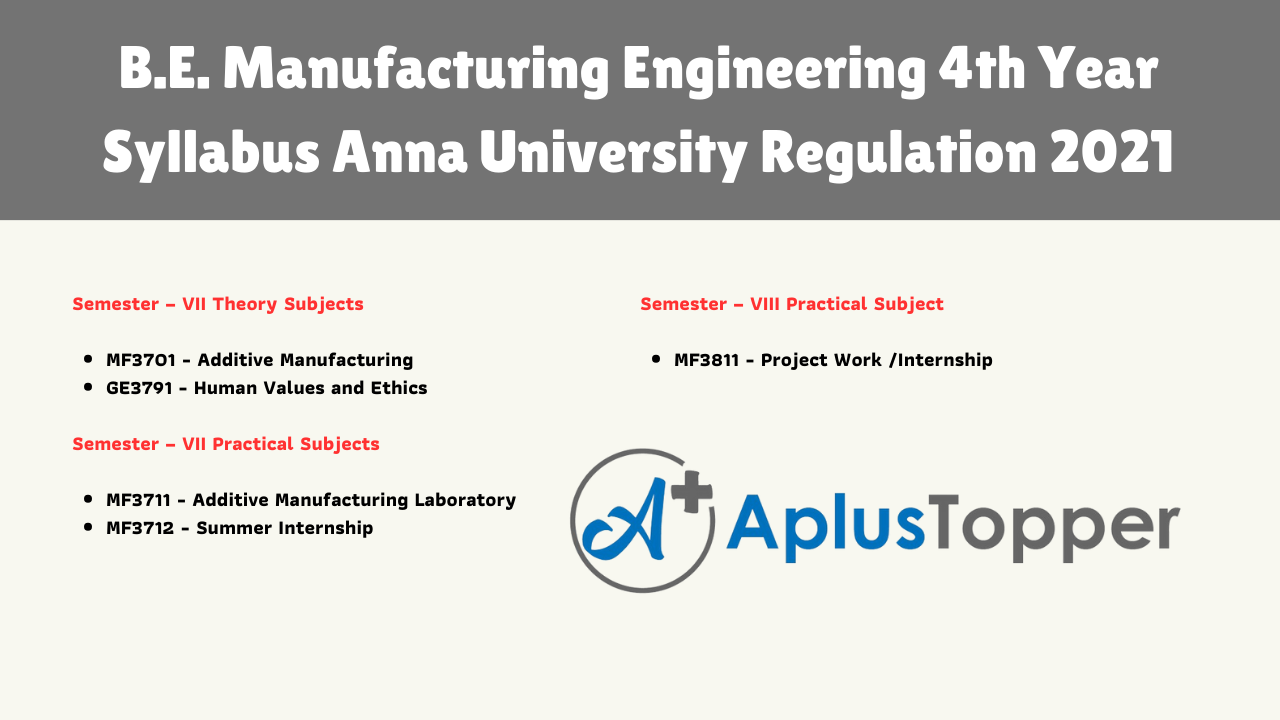 Anna University B.E Manufacturing Engineering 4th year syllabus consists of two semesters. Each semester has both theory and practical subjects. In semester VII, there are two theory subjects and two practical subjects. In semester VIII, There is only one practical subject.