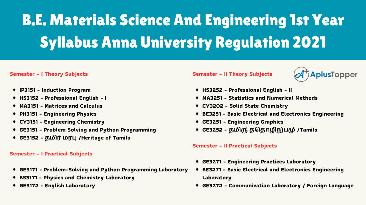 B.E. Materials Science And Engineering 1st Year Syllabus Anna University Regulation 2021