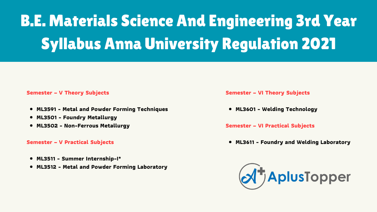 Anna University Regulation 2021, B.E Materials Science and Engineering Third year has two semesters. Each semester has both theory and practical subjects. There are 3, 2 theory and practical subjects in semester V. There is 1, 1 theory and practical subjects in semester VI. The following links will help you to find the particular subject as per your requirements.