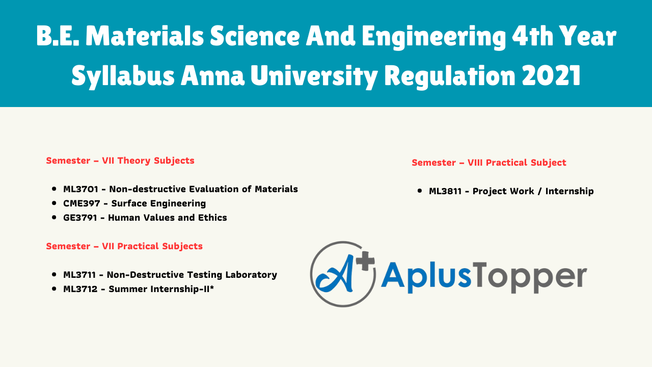 Anna University Regulation 2021, B.E Materials Science and Engineering Fourth year has two semesters. Each semester has both theory and practical subjects. There are 3, 2 theory and practical subjects in semester VII. There is only one practical subject in semester VIII. The following links will help you to find the particular subject as per your requirements.