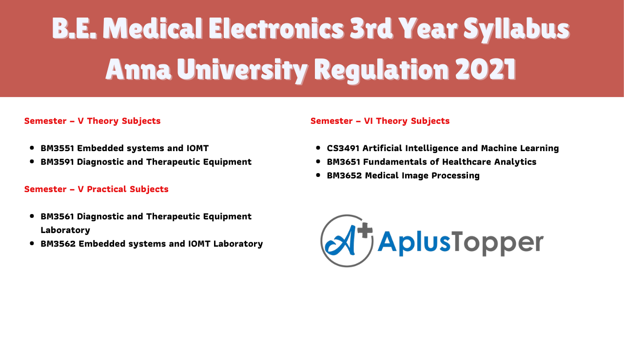 Anna University Regulation 2021 B.E. Medical Electronics 3rd-year syllabus contains two semesters. In semester 5, there are two theory subjects and two practical subjects. In semester 6, there are three theory subjects. The following links will help you to get the required subject as per your need.