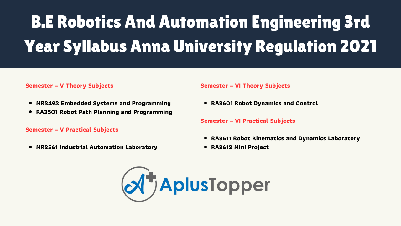 B.E robotics and automation engineering at Anna University is dynamic. If you have opted for this course as your career choice, after the program you must acquire the subject knowledge and excel in academics. If the University is satisfied with your academic performance they will award you with a qualified academic certificate. To achieve that certificate you must perform well in this four-year undergraduate program of B.E Robotics and Automation Engineering. For that, you need a required syllabus along with practical knowledge. In this following article, we can provide the four-year degree syllabus including both theory and practical subjects as yearly, semester, and subject-wise syllabi. You can simply open the site and read, by following the images and the links we provided in the given below article. Don’t forget to share it with your classmates.