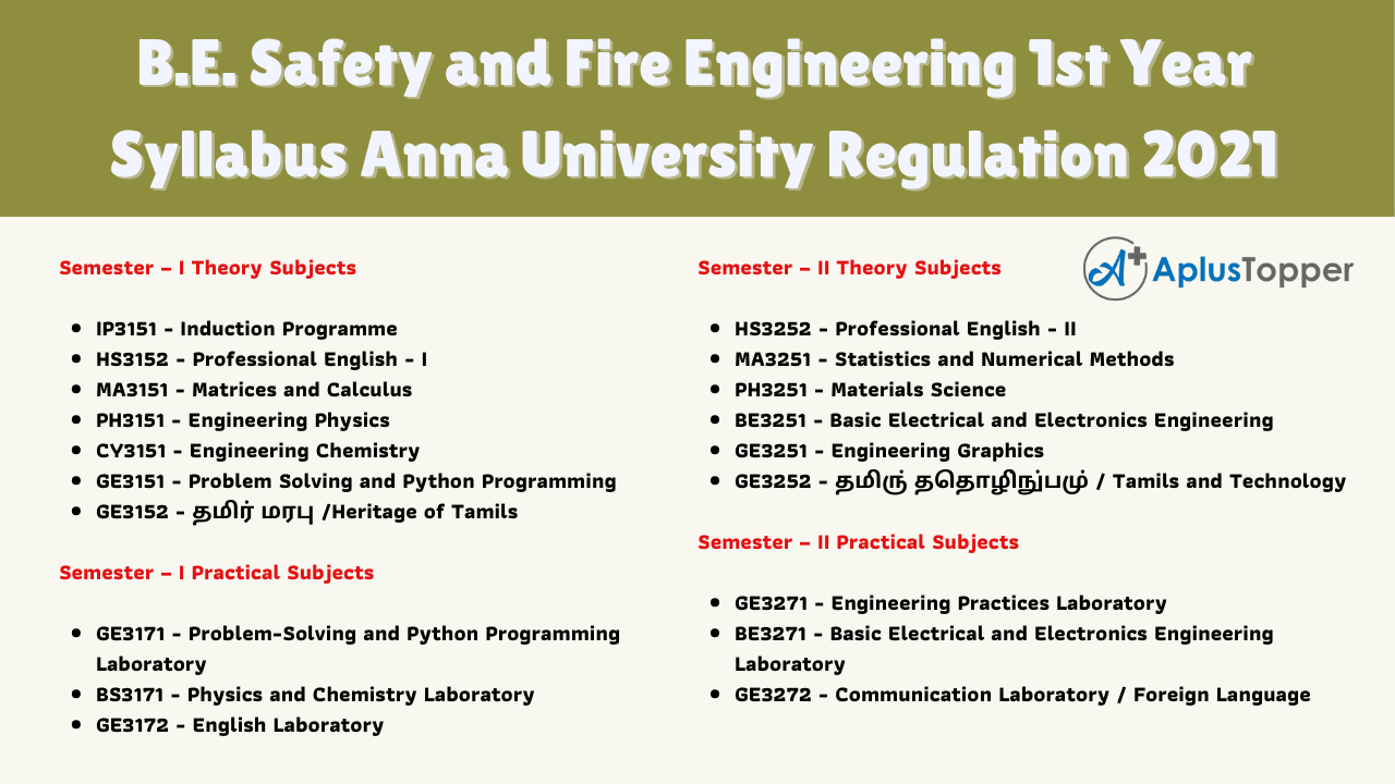 Anna University Regulation 2021 B.E. Safety and Fire Engineering 1st year syllabus contains two semesters. In semester 1, there are six theory subjects and three practical subjects. In semester 2, there are six theory subjects and three practical subjects. The following links will help you to get the required subject as per your need.