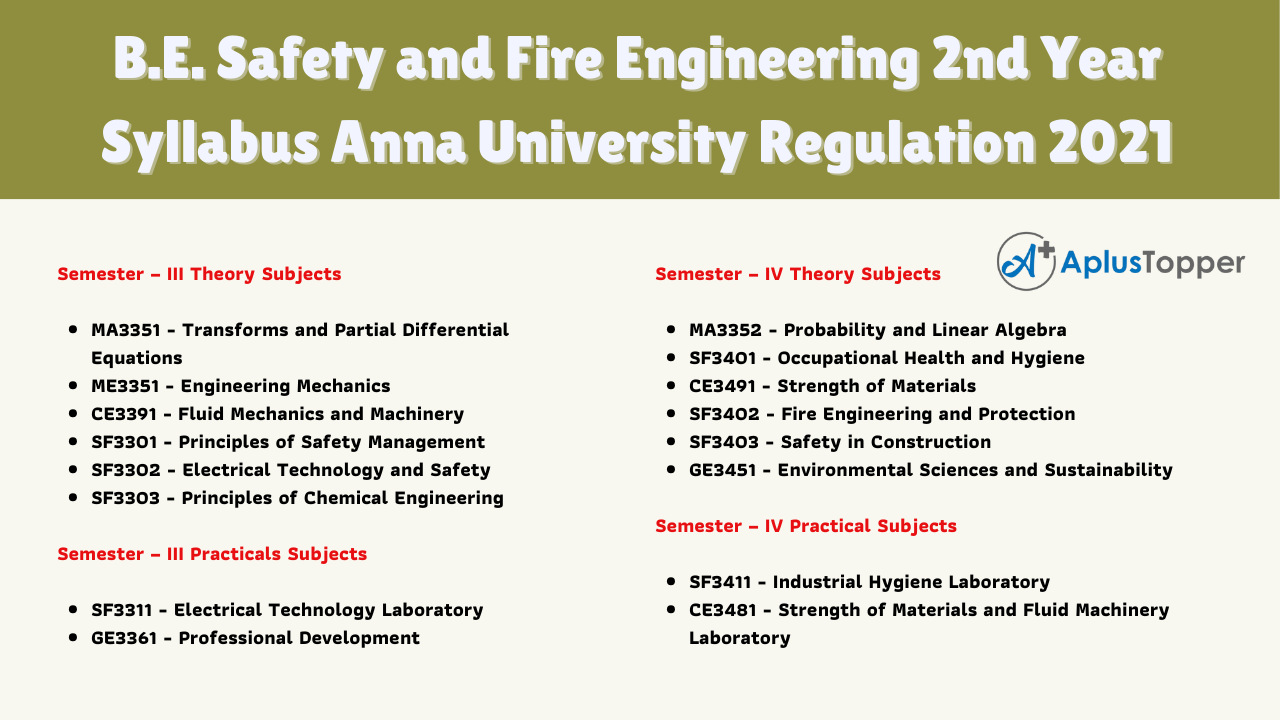 Anna University Regulation 2021 B.E. Safety and Fire Engineering 2nd year syllabus contains two semesters. In semester 3, there are six theory subjects and three practical subjects. In semester 4, there are six theory subjects and two practical subjects. The following links will help you to get the required subject as per your need.
