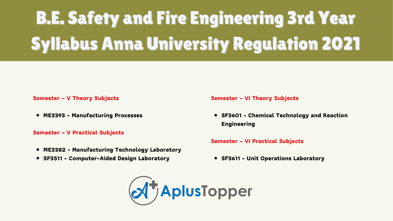 Anna University Regulation 2021 B.E. Safety and Fire Engineering 3rd year syllabus contains two semesters. In semester 5, there is one theory subject and two practical subjects. In semester 6, there is one theory subject and one practical subject. The following links will help you to get the required subject as per your need.