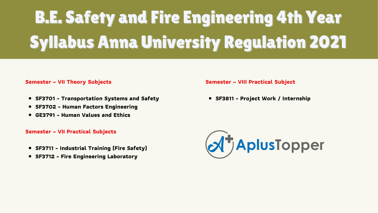 Anna University Regulation 2021 B.E. Safety and Fire Engineering 4th year syllabus contains two semesters. In semester 7, there are three theory subjects and two practical subjects. In semester 8, there is one practical subject. The following links will help you to get the required subject as per your need.