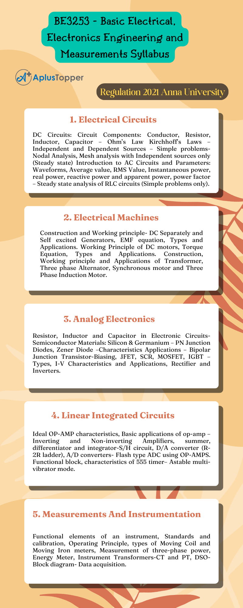 BE3253 deals with the semester II B.E Robotics and Automation Syllabus at Anna University based on regulation 2021. In this article, we discuss the Basic Electrical, Electronics Engineering, and Measurements syllabus along with textbooks and references.