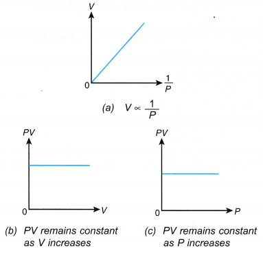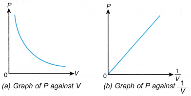 - The graph of P against 1/V is a straight line passing through the origin. This shows that P ∝ 1/V, that is, the pressure is inversely proportional to the volume.